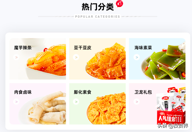 我们先从卫龙的业务版图说起。从小小辣条起家并与时俱进,如今的卫龙已经将品类从大面筋、小面筋、大辣棒、亲嘴烧等经典调味面制品,拓展到了蔬菜制品和豆制品,推出了包括魔芋爽、风吃海带等热量低、口感脆爽的产品,以及软豆皮、78°卤蛋在内的豆制品和其他产品。