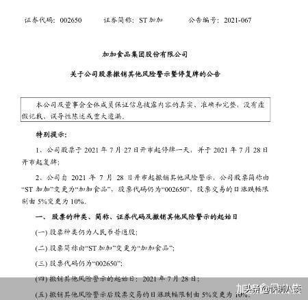 7月26日,加加食品发布公告称,公司股票于7月27日开市起停牌一天,并于7月28日开市起复牌,撤销其他风险警示,公司股票简称由“ST加加”变更为“加加食品”,股票交易的日涨跌幅限制由5%变更为10%。